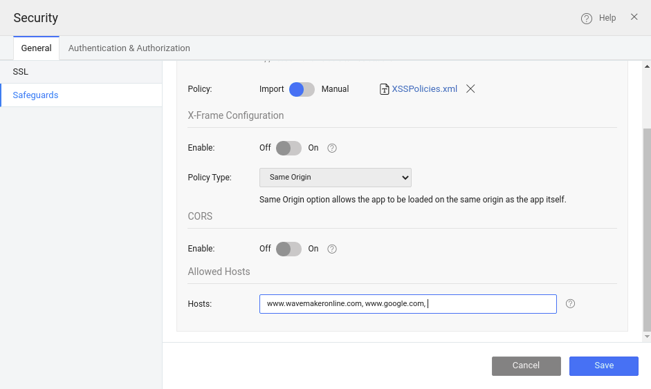 In a WaveMaker application, the list of allowed Hostnames can be configured from Security -> Safeguards dialog, as shown below.
