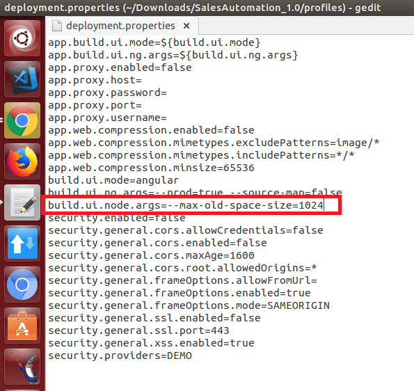 • On build failure due to the out-of-memory error, the profile property called build.ui.node.args should be adjusted; this configures the build. Increase the max-old-space-size memory value where the default value is 1024 MB. The build should be triggered again after increasing the memory value. There are two ways to do this: