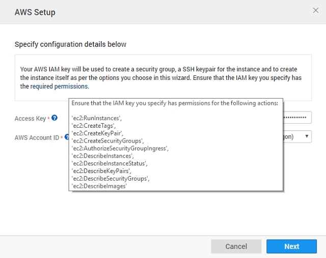 • While setting up the AWS account care should be taken to ensure that the IAM key has the permissions as listed in the configuration dialog. Steps in AWS Configuration:
