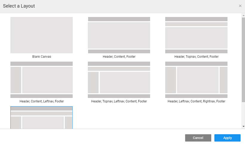 A Page Layout has the following containers - a header, navigation bar, content, and footer. The content can have one, two or three columns. To change the layout of a page, simply click on the desired layout to see it take effect on the design canvas.