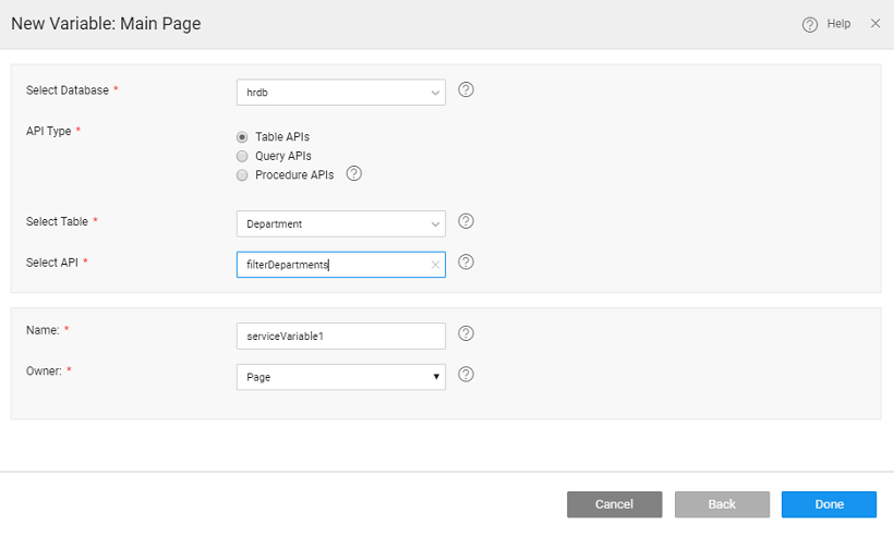 For every database table imported into the app, APIs are generated. In addition to the CRUD operations, functionalities like Count, Filter, Get by field name, Get associated table data etc. can be accessed through the corresponding APIs. These Database APIs also include those corresponding to Queries and Procedures created within the data model.