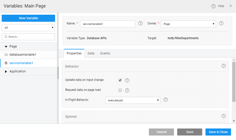 • the properties tab contains all the properties like server options, behavior and spinner behavior. (Click on the Variable to view the Variable definition). Know more about properties.