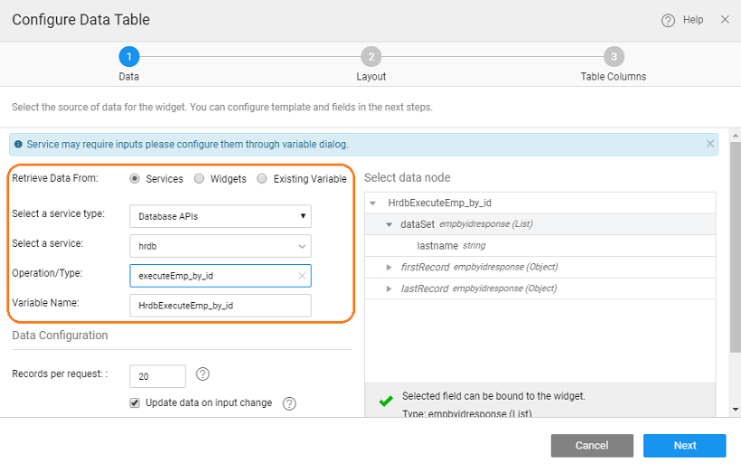 We will show the steps in creating Variable using the Data Table widget. The steps will be same for any Data Widgets