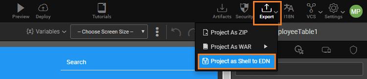 • Enterprise version: Once the developer exports a project as Shell to EDN, they will be prompted to enter the publishing information, see artifact features for more information. The EDN Admin has to approve or reject the Shell as with any other Artifact. Once approved, developers can select the Shell when creating new projects.