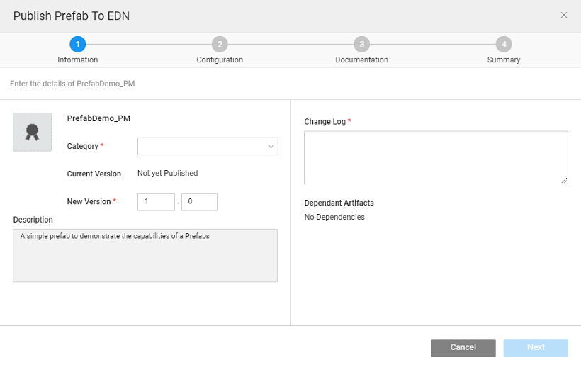 1. Publish Info: This requires the Developer to enter the Category, Version, and Change Log. In case this Artifact uses or has a dependency on other Artifacts (for example, Project Shell using a Prefab), the dependencies are listed here.