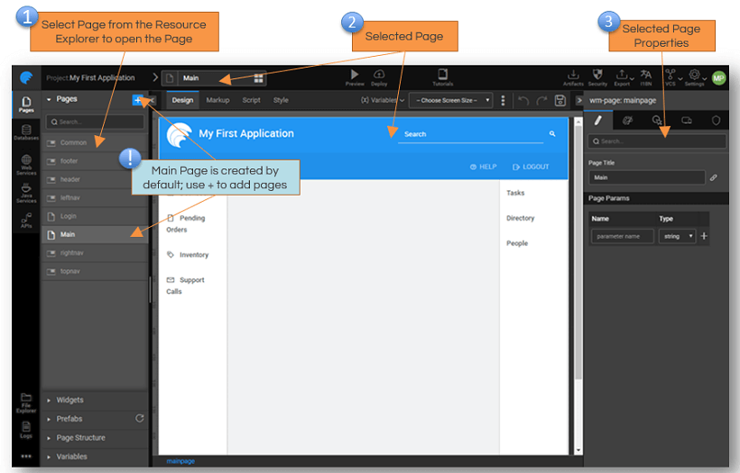 Once you create a project, the Main Page is created by default. You can add pages to the app, by using the + button next to the Page on Resource Explorer. On selection of a page, Canvas is provided:
