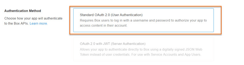 7. Select Authentication Method as Standard OAuth 2.0(User Authentication) to authenticate the Box APIs.