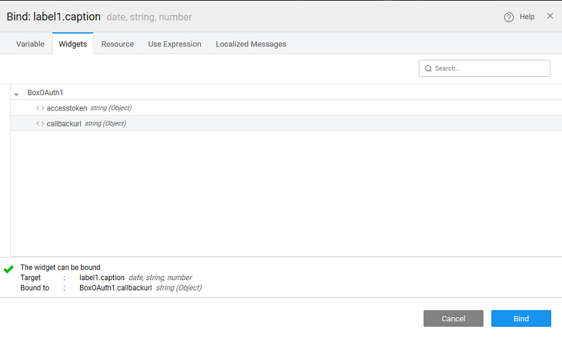 2. Drag and drop a Label in the canvas. Click on Bind property to bind label with the callbackurl property of the Box OAuth prefab.