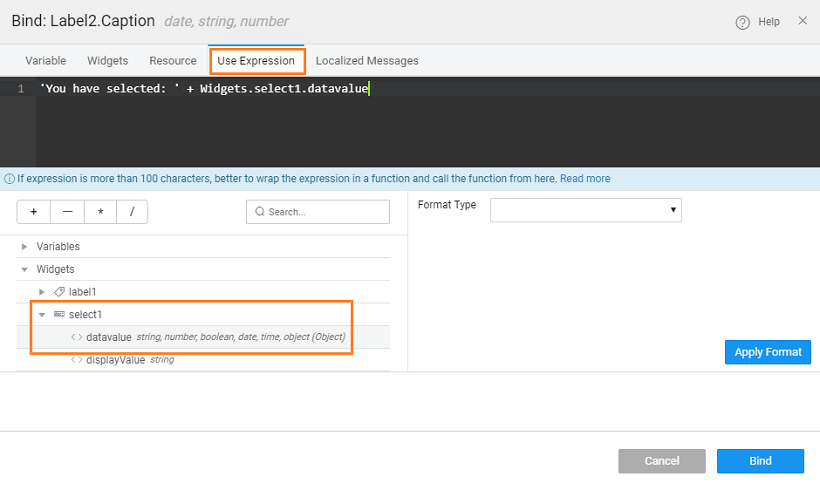 6. The selection made by the user is displayed in a Label widget, by binding the select datavalue to it.