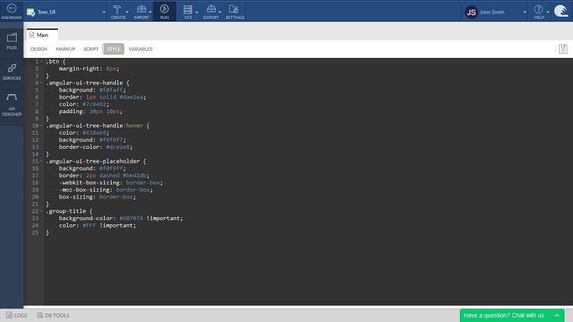 1. From Main Menu use Create option to Create a Static Variable, defaultTreeData, to hold the default tree structure. Select the is List option and enter the Json structure. The structure needs to include id, title, and nodes for subitems.