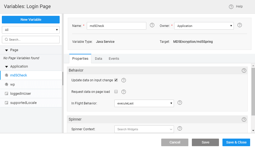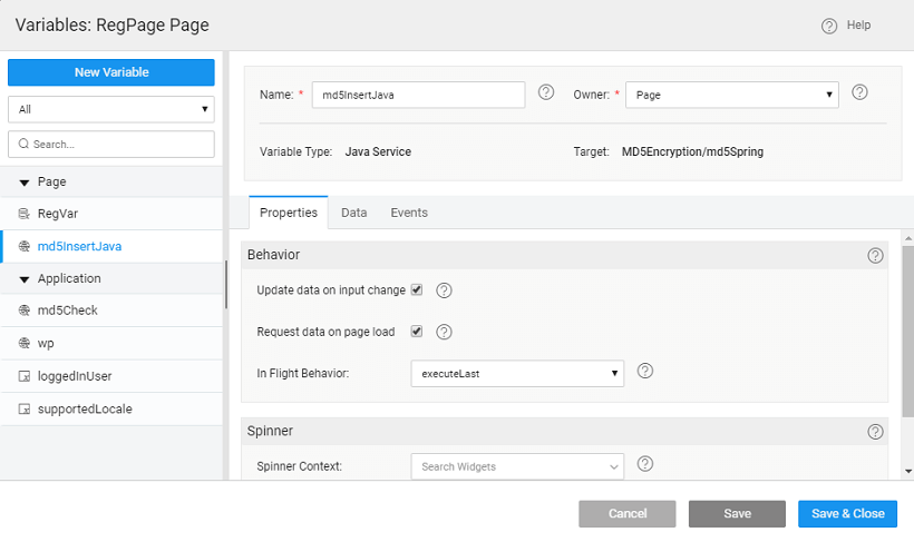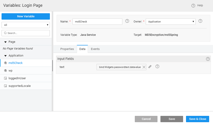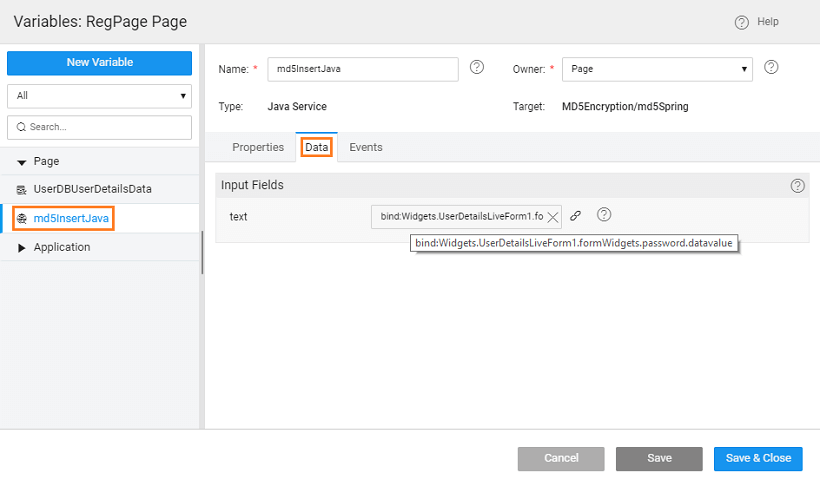 - Add the following to the Java Service code. Here we are using an MD5 hashing algorithm to generate a checksum for the password field, refer here for more details. Ensure that the length of the password column in the database is greater than the length of the result from the encryption algorithm used, in this case, it should be greater than 32.