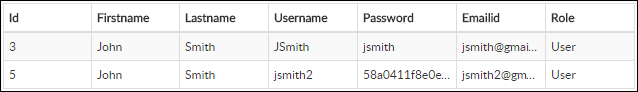 - Two column layout with first name, last name and email id in the first column; username, password, and role in the second column.