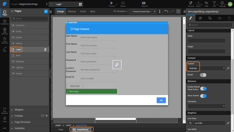 - Add a pagedialog widget, with content as the registration partial page.