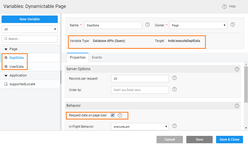 2. Create a Database API variables for the queries created above. Call them, say DeptData and UserData Note: Make sure you have checked the Request Data on Page Load option for the variables created above.