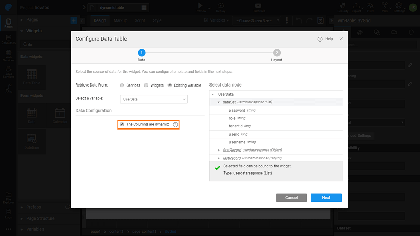 4. Drag and drop a Data Table widget on the canvas. While configuring the Data Table, select the option “The columns are dynamic”. Also, please note that we have chosen the UserData as the Source Variable. Thus User data will be displayed initially. You can configure it to any variable of your choice.