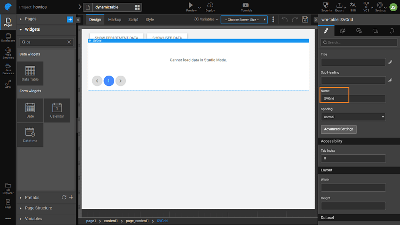 5. Rename the Data Table to “SVGrid” or any other valid name as per your scenario (this name is used in the JavaScript code later).