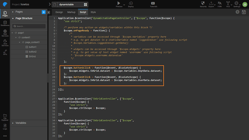 Page.button1Click = function ($event, widget) { Page.Widgets.SVGrid.dataset = Page.Variables.DeptData.dataSet; };