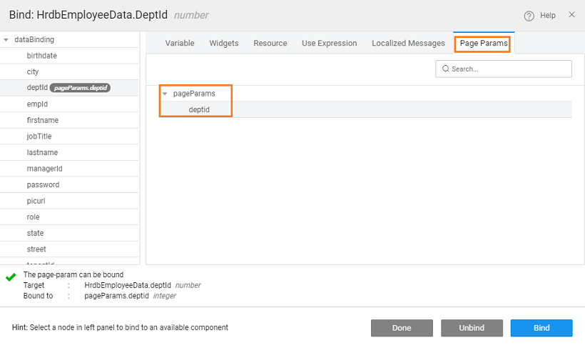 1. Pass Parameter: Now we need to pass the selected row deptid to the Employee page. Select the goToPage_Employee from the Actions dialog and select the Data tab. Click the bind icon next to the deptid