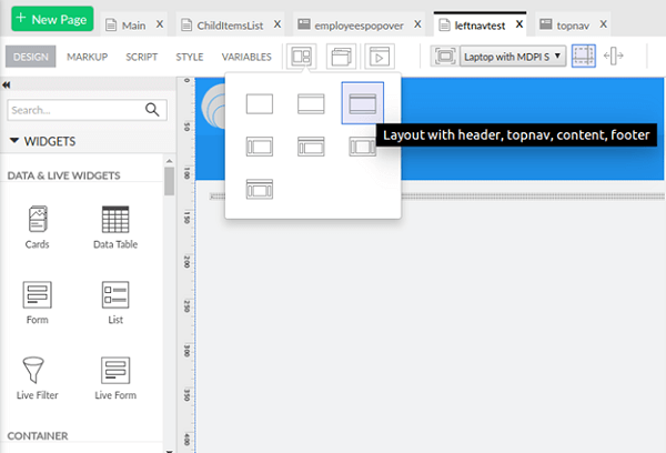 1. For the Main page, choose the Layout with header, topnav, content and footer.