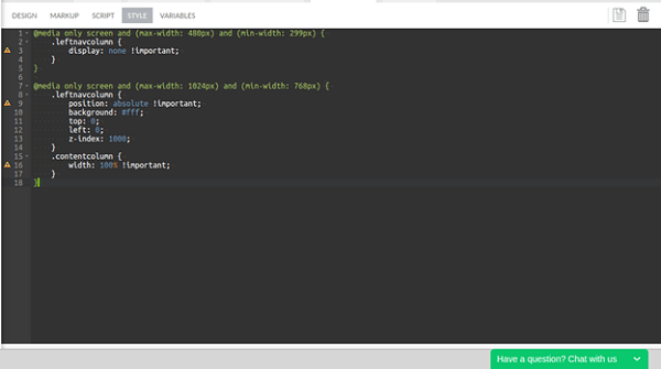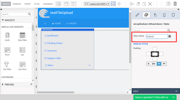 1. Navigate to the Style tab of the properties panel and set the Class Name property for this grid column as “hidden”.