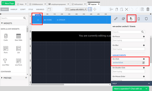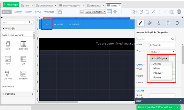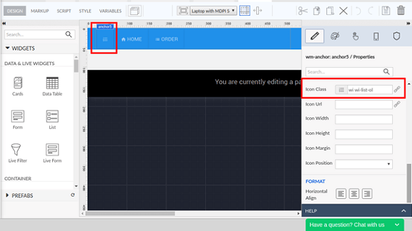 3. Open the topnav partial page and add an anchor widget. Specify the icon Class as “wi wi-list-ol” for the newly added anchor.