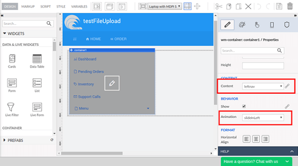 1. Add a container in this grid column and choose the Content property for the container widget from the properties panel as “leftnav”. Here, we have added an animation for the container widget as “slideInLeft”. You can choose any animation as per your choice.