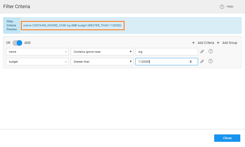 5. Filter Criteria Preview gives you the filter expression based on the criteria and groups that you add.