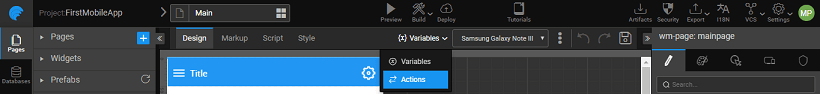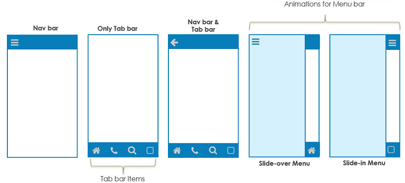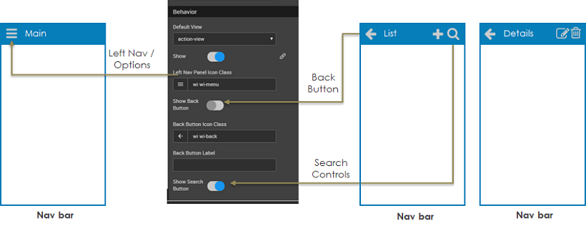 As mentioned in the previous section, default top navbar can be selected as part of the Page Layout. This Navbar can be configured to enable pre-defined controls for left navigation, back button or search. In addition, custom actions like add, edit, delete etc. can also be incorporated. Navbar can have Menu, Popover widgets.