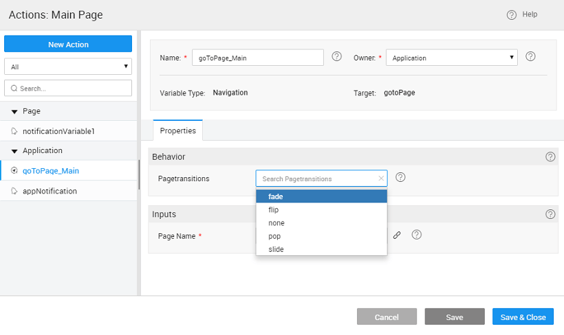 Navigation Action specifies exactly how the user should move from one page to another when an event occurs. Navigation Action is a component you can add to your project and provide the following options: