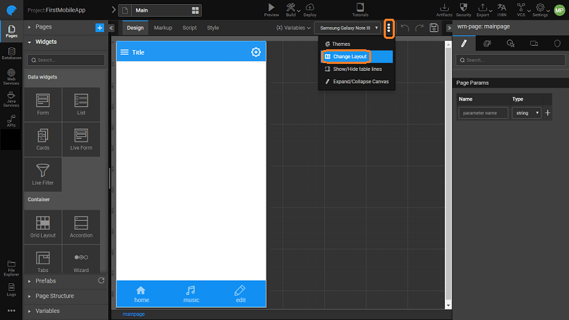 As mentioned in UI Design Overview, a WaveMaker app is a collection of pages. Same is true for Mobile Apps. Each page can be designed by selecting a proper layout and arranging widgets within it. The app flow can be achieved using page navigation and actions to trigger this navigation.