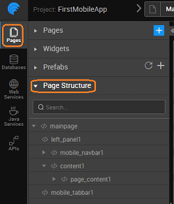 A typical page layout with mobile navbar, tabbar and content have the following structure, as can be seen from the Files tab on the Files and Services panel on the left: