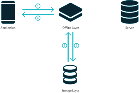 The offline layer intercepts all data requests. When the app is online, it forwards the request to the server and receives the responses from the server. When the app is offline, it consumes the request and provides the response. The offline layer includes: