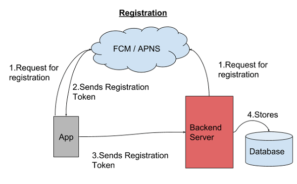 1. Mobile App registers for device notifications and gets registration token. This token functions as the address to send a push notification to.