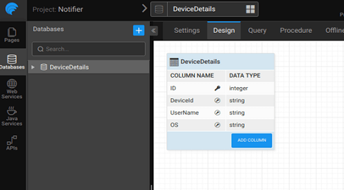2. Create a db named DeviceDetails, which will store all the deviceIds, username and device type i.e. OS (Android or iOS). Mark these columns as unique.