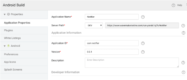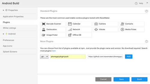 • The plugin that is mentioned above uses ‘hook’ concept of Cordova for Android build. But, Hooks are not supported in build.phonegap.com. So, Android builds fail when this plugin is added in build.phonegap.com. But, Android app can be built using the using Build For Android menu option inside WaveMaker studio or through a manual build.