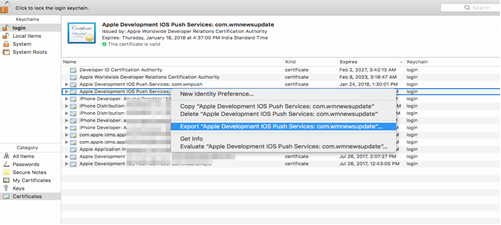 3. Navigate to the certificate you want to use for your push notifications. Right-click and export it as a P12 certificate. Use as name apns-dev-cert.p12 (in case of the development certificate). In this demo app, this certificate is named as Certificates.p12. When prompted enter a password to protect the file and note it for future use.