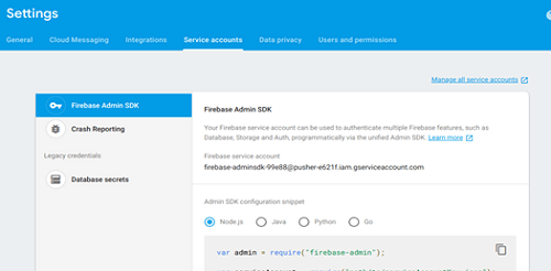 1. In Firebase Console, go to settings and open ‘Service Accounts’ tab.