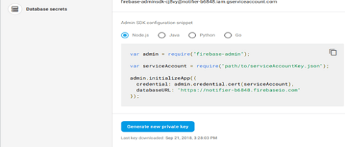 Firebase also provides another JSON file that is required by the backend to push messages. This JSON is called the service JSON.