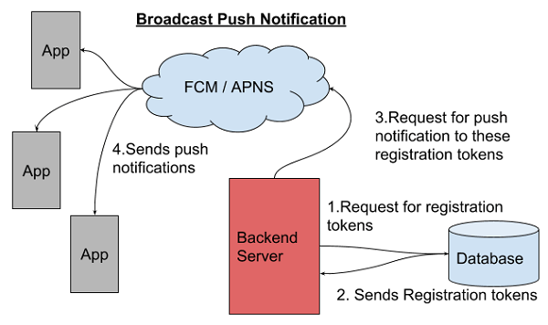 1. When Backend wants to send a push notification to users, Backend retrieves the stored registration tokens of devices of those users.