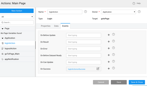 1. On every successful login, register the device for receiving the push notification. For this, open the Actions dialog and select the pre-defined loginAction.