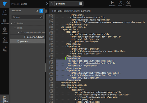 1. From File Explorer open pom.xml and add firebase-admin and javapns-jdk16 as dependencies as shown below: