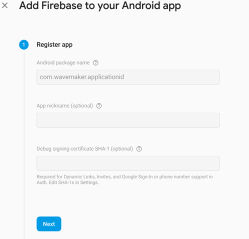 1. A form appears to register your app. Application id that is mentioned in ‘export cordova dialog’ of your WaveMaker project has to be entered as Android package name in this form. Click Next.