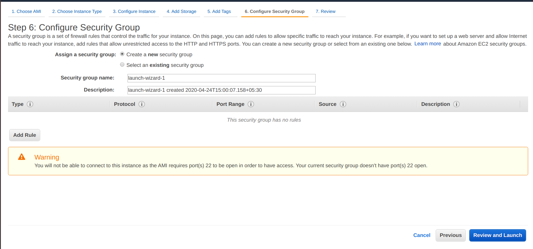 • Provide essential details for creating the security group and select the previously selected VPC.