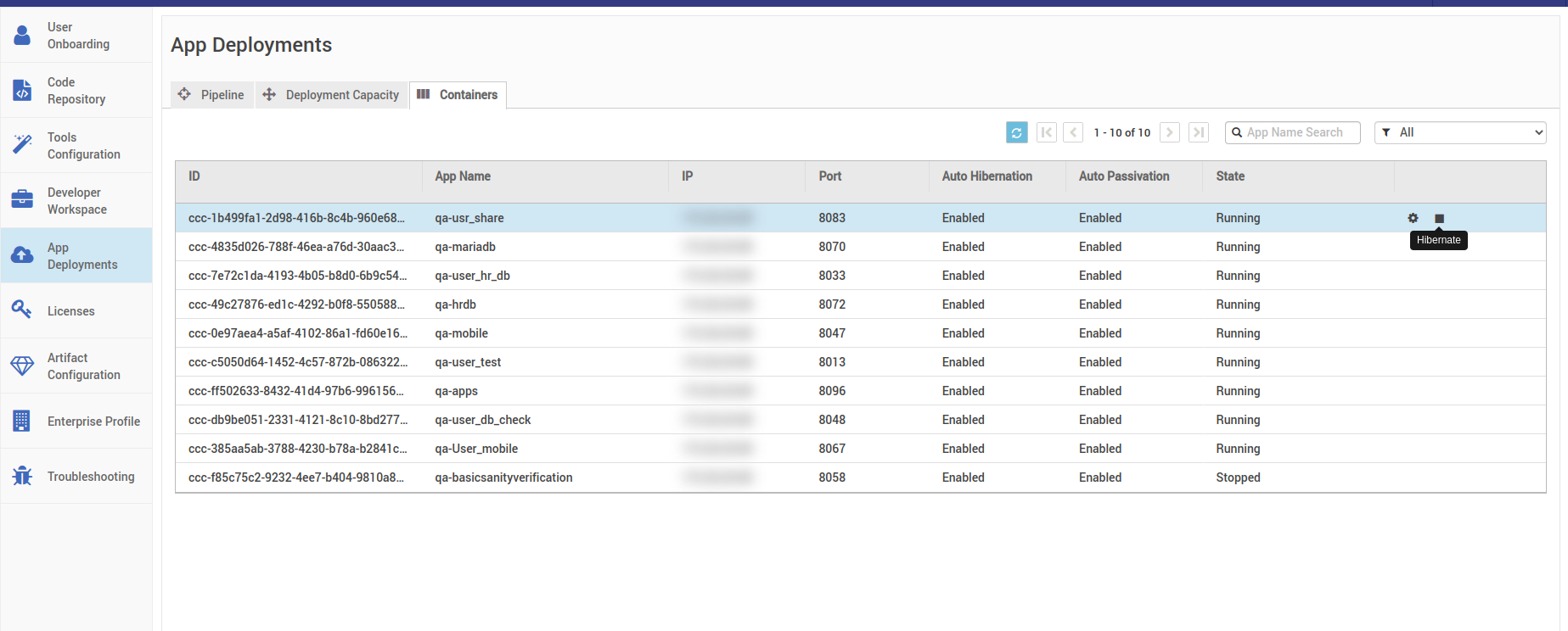 Passivate Containers in StudioWorkspace/AppDeployment Instances