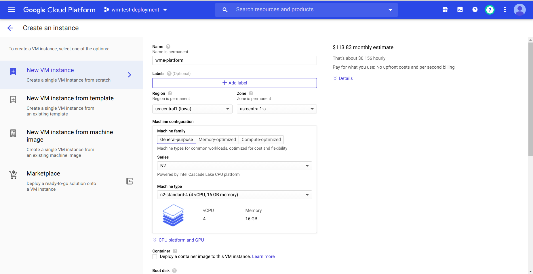 • Select region,zone and provide name for Instance.select machine type with minimum 16 GB memory.