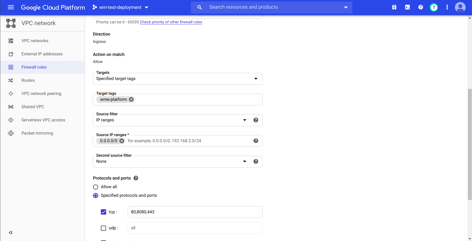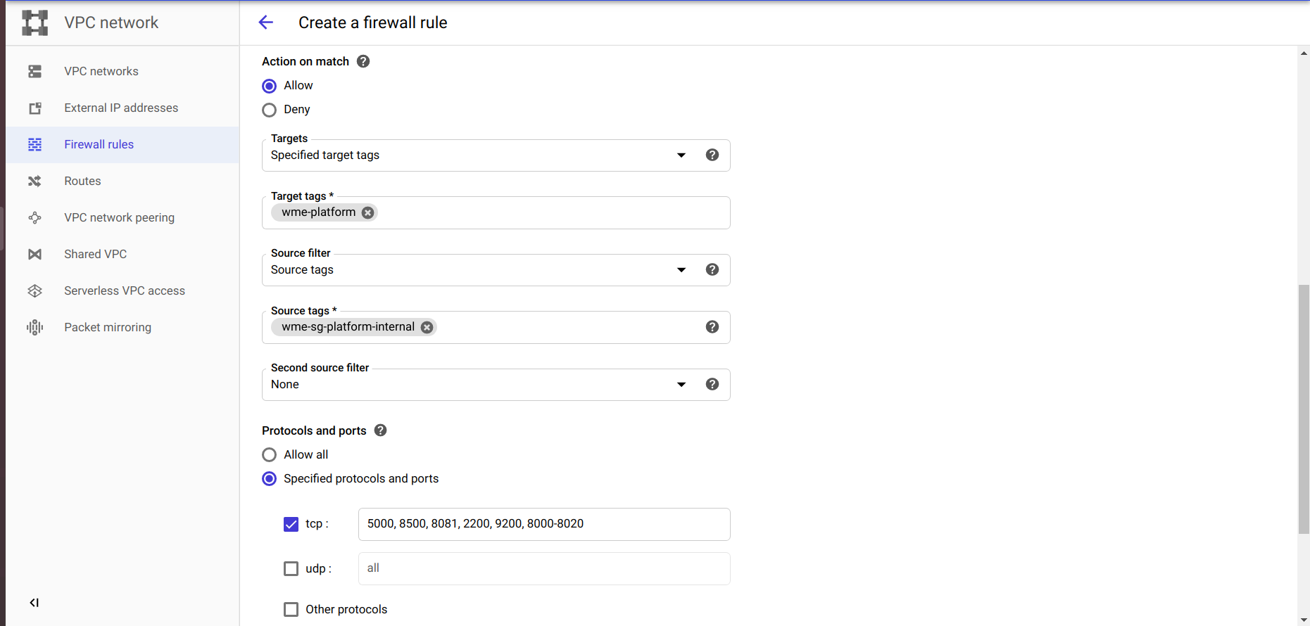 • Select target type and source filter type. by using the target we can connect the firewall rule to Instance. example the which Instance have target tag the firewall is connect to that Instance and by using the source we can open ports to specific Instance. example the which Instance have a source tag the ports will be open to that Instance.we provide this tags at network section during the Instance creation.or else you can select your own Target and Source methods.