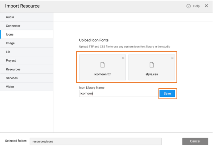 - Upload the ttf and CSS files of the icon family and enter the library name. Click Save.