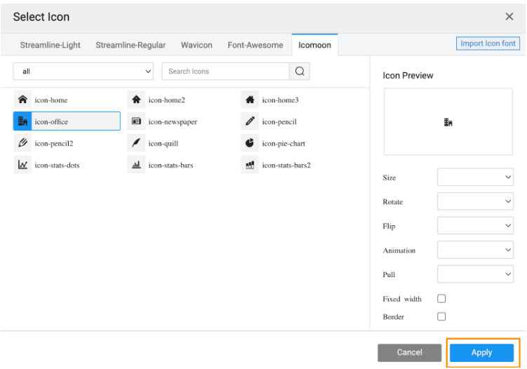 - Open the Select Icon dialog to view the uploaded icons family.