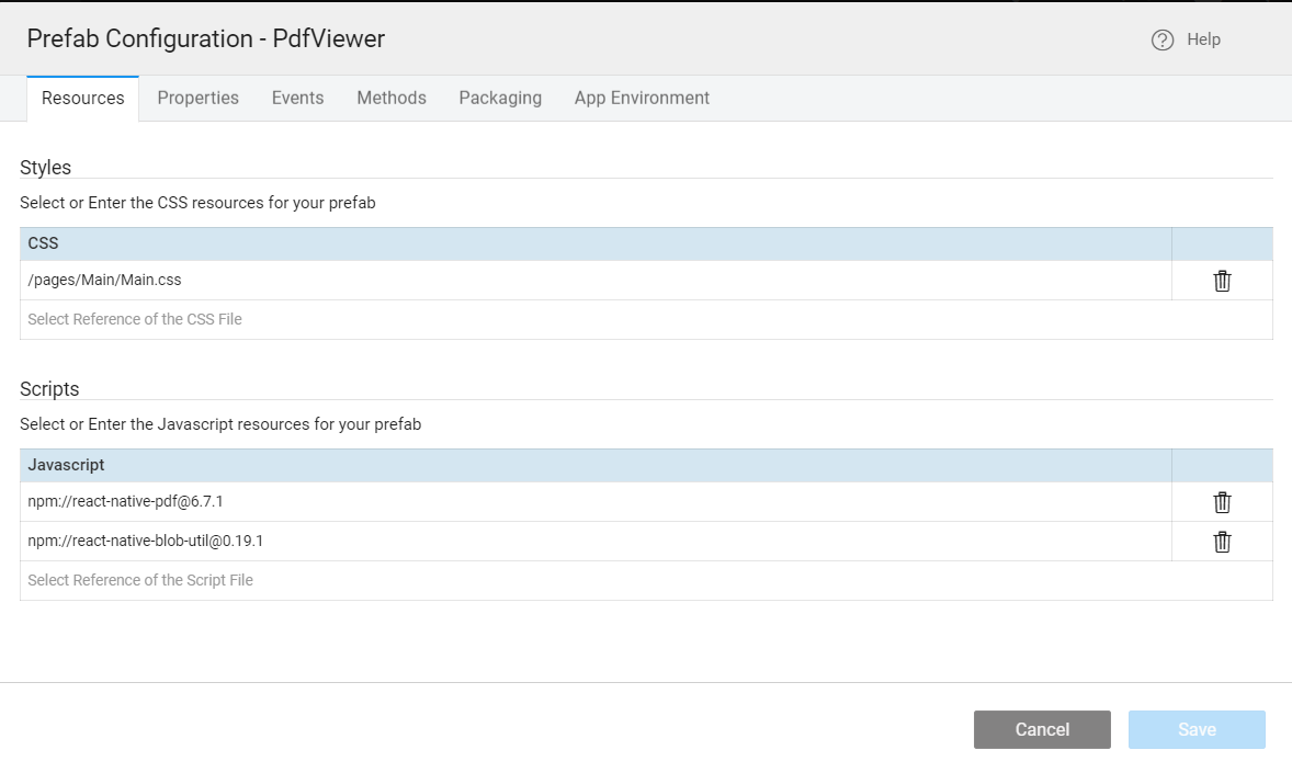 Click on setting then click on Config Prefab. Now, select Resources tab and In Script section add react-native-pdf and