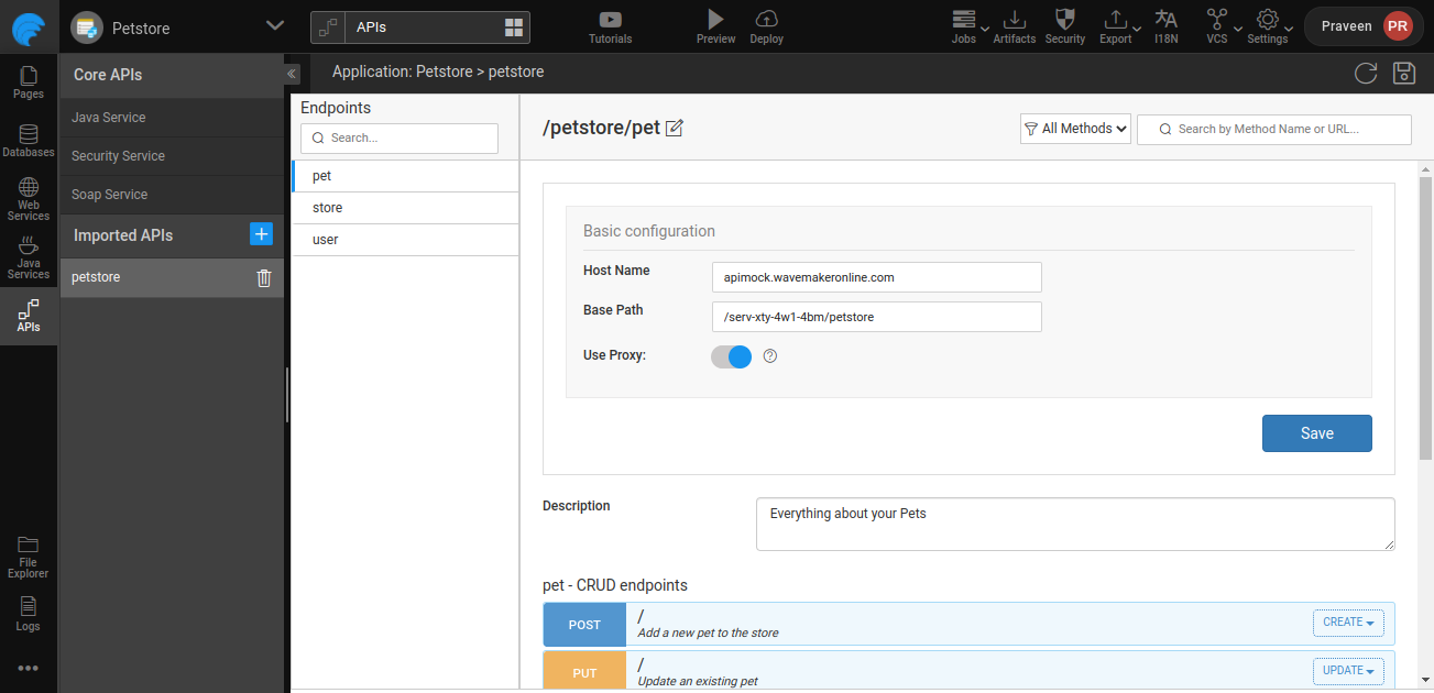 • Go to WaveMaker Studio, Click APIs and Imported APIs.